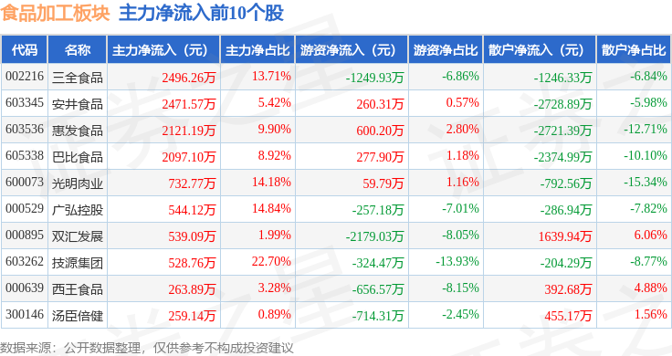 从资金流向上来看,当日食品加工板块主力资金净流入4358.53万元,游资资金净流出1202.37万元,散户资金净流出3153.17万元。食品加工板块个股资金流向见下表: