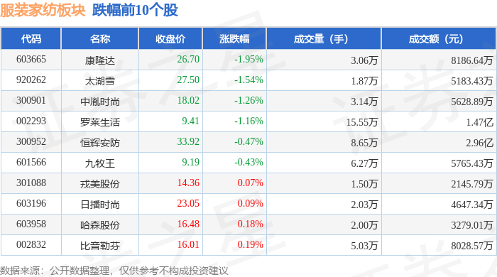 从资金流向上来看,当日服装家纺板块主力资金净流出1.04亿元,游资资金净流出6316.82万元,散户资金净流入1.67亿元。服装家纺板块个股资金流向见下表: