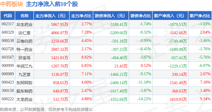 从资金流向上来看,当日中药板块主力资金净流出8601.68万元,游资资金净流出1.35亿元,散户资金净流入2.21亿元。中药板块个股资金流向见下表: