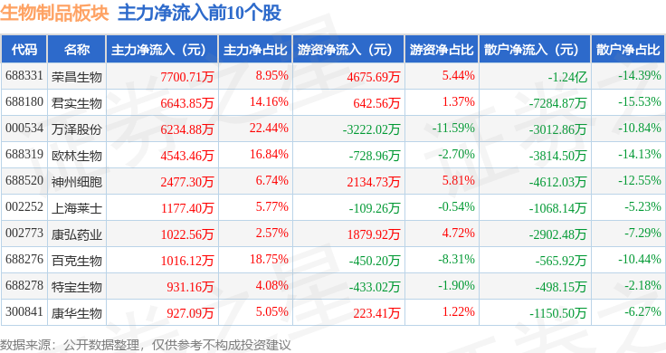 从资金流向上来看,当日生物制品板块主力资金净流出1.55亿元,游资资金净流入2.27亿元,散户资金净流出7179.12万元。生物制品板块个股资金流向见下表: