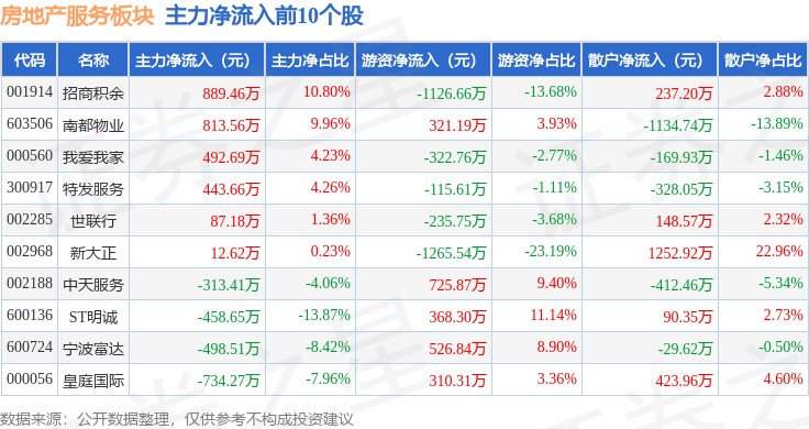 从资金流向上来看,当日房地产服务板块主力资金净流出5581.71万元,游资资金净流入2110.28万元,散户资金净流入3470.15万元。房地产服务板块个股资金流向见下表: