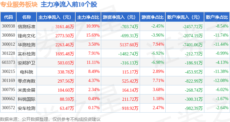从资金流向上来看,当日专业服务板块主力资金净流出3039.35万元,游资资金净流入8894.41万元,散户资金净流出5855.06万元。专业服务板块个股资金流向见下表: