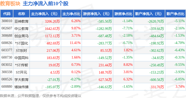 从资金流向上来看,当日教育板块主力资金净流出568.43万元,游资资金净流出354.43万元,散户资金净流入922.77万元。教育板块个股资金流向见下表: