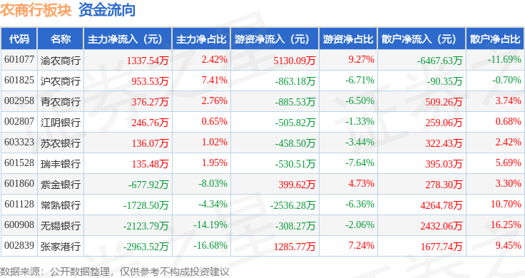 从资金流向上来看,当日农商行板块主力资金净流出4308.08万元,游资资金净流入727.39万元,散户资金净流入3580.69万元。农商行板块个股资金流向见下表: