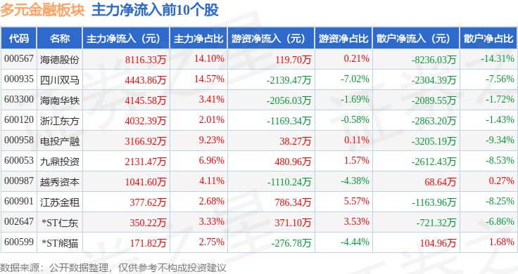 从资金流向上来看,当日多元金融板块主力资金净流出1368.55万元,游资资金净流出1734.44万元,散户资金净流入3102.63万元。多元金融板块个股资金流向见下表: