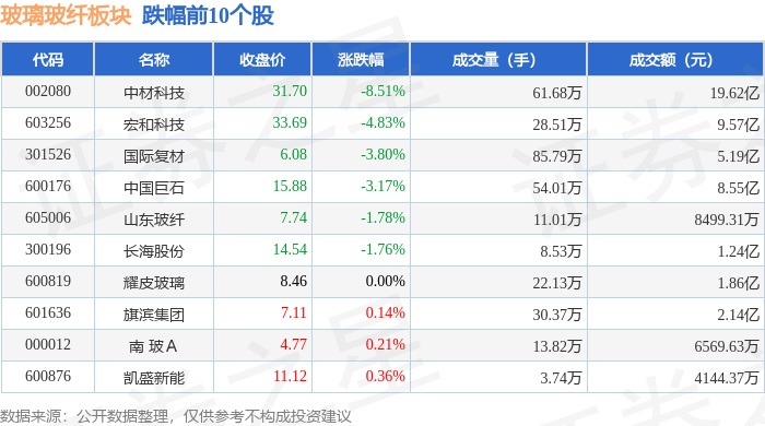 证券之星消息,11月3日玻璃玻纤板块较上一交易日下跌3.49%,中材科技领跌。当日上证指数报收于3976.52,上涨0.55%。深证成指报收于13404.06,上涨0.19%。玻璃玻纤板块个股涨跌见下表: