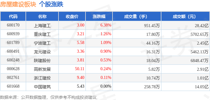 证券之星消息,11月3日房屋建设板块较上一交易日上涨0.63%,上海建工领涨。当日上证指数报收于3976.52,上涨0.55%。深证成指报收于13404.06,上涨0.19%。房屋建设板块个股涨跌见下表: