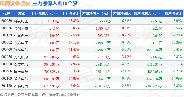 从资金流向上来看,当日电网设备板块主力资金净流入26.76亿元,游资资金净流出5.34亿元,散户资金净流出21.42亿元。电网设备板块个股资金流向见下表: