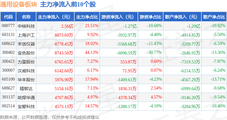 从资金流向上来看,当日通用设备板块主力资金净流出1.42亿元,游资资金净流入6529.51万元,散户资金净流入7642.33万元。通用设备板块个股资金流向见下表: