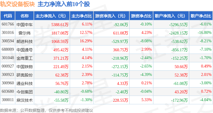 从资金流向上来看,当日轨交设备板块主力资金净流出4602.55万元,游资资金净流入8213.84万元,散户资金净流出3611.86万元。轨交设备板块个股资金流向见下表: