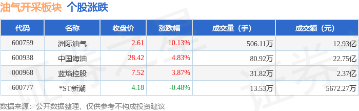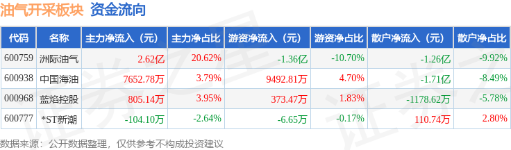 从资金流向上来看,当日油气开采板块主力资金净流入3.46亿元,游资资金净流出3753.57万元,散户资金净流出3.08亿元。油气开采板块个股资金流向见下表: