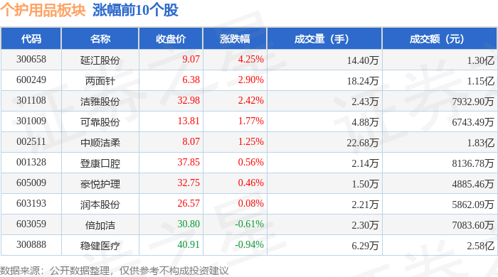 证券之星消息,11月3日个护用品板块较上一交易日下跌0.38%,依依股份领跌。当日上证指数报收于3976.52,上涨0.55%。深证成指报收于13404.06,上涨0.19%。个护用品板块个股涨跌见下表: