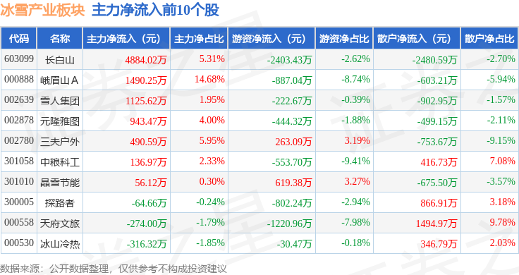 从资金流向上来看,当日冰雪产业板块主力资金净流出1769.91万元,游资资金净流出5434.53万元,散户资金净流入7204.44万元。冰雪产业板块个股资金流向见下表: