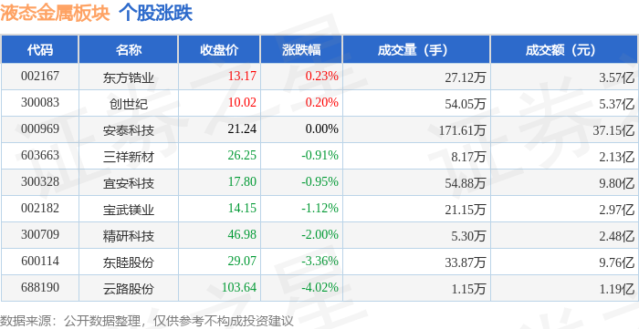 证券之星消息,11月3日液态金属板块较上一交易日下跌1.31%,云路股份领跌。当日上证指数报收于3976.52,上涨0.55%。深证成指报收于13404.06,上涨0.19%。液态金属板块个股涨跌见下表:
