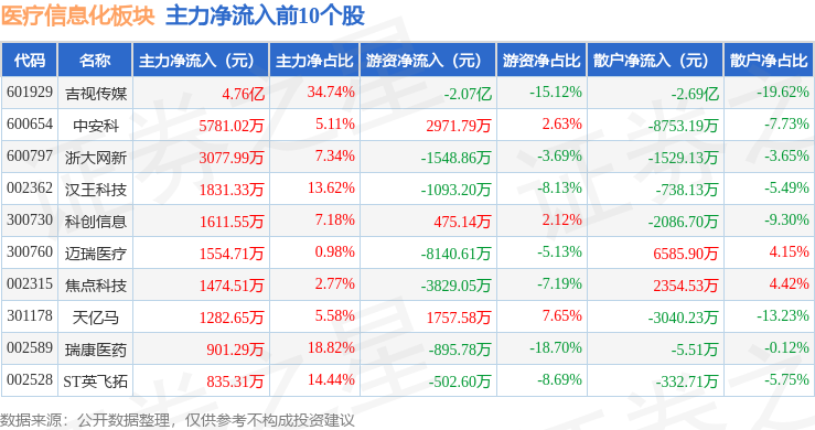 从资金流向上来看,当日医疗信息化板块主力资金净流出3.51亿元,游资资金净流入1.03亿元,散户资金净流入2.48亿元。医疗信息化板块个股资金流向见下表: