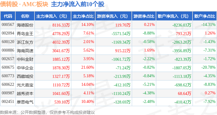从资金流向上来看,当日债转股 · AMC板块主力资金净流入1.11亿元,游资资金净流出4249.76万元,散户资金净流出6850.42万元。债转股 · AMC板块个股资金流向见下表: