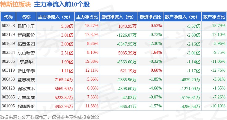 从资金流向上来看,当日特斯拉板块主力资金净流出55.0亿元,游资资金净流入7.89亿元,散户资金净流入47.12亿元。特斯拉板块个股资金流向见下表: