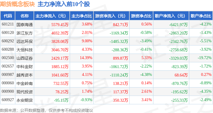 从资金流向上来看,当日期货概念板块主力资金净流出6.41亿元,游资资金净流入5.05亿元,散户资金净流入1.36亿元。期货概念板块个股资金流向见下表: