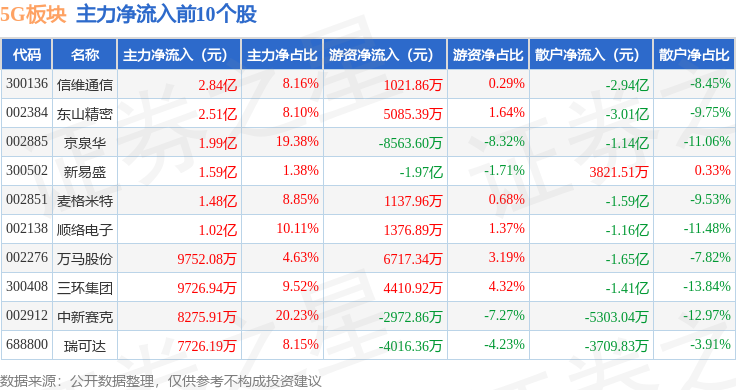 从资金流向上来看,当日5G板块主力资金净流出38.67亿元,游资资金净流入15.59亿元,散户资金净流入23.09亿元。5G板块个股资金流向见下表: