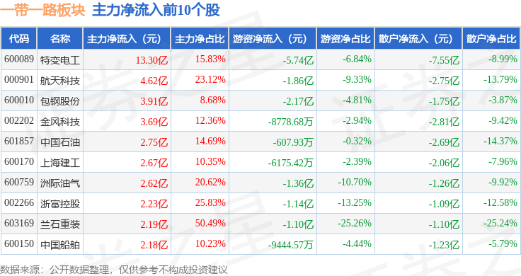 从资金流向上来看,当日一带一路板块主力资金净流入7.3亿元,游资资金净流出15.82亿元,散户资金净流入8.52亿元。一带一路板块个股资金流向见下表: