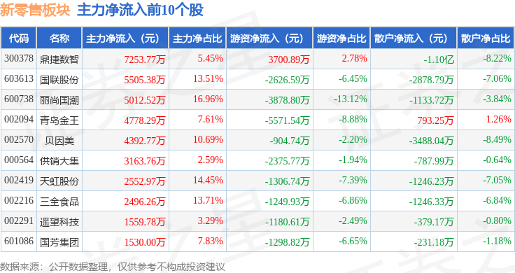 从资金流向上来看,当日新零售板块主力资金净流出1.16亿元,游资资金净流出2.23亿元,散户资金净流入3.39亿元。新零售板块个股资金流向见下表:
