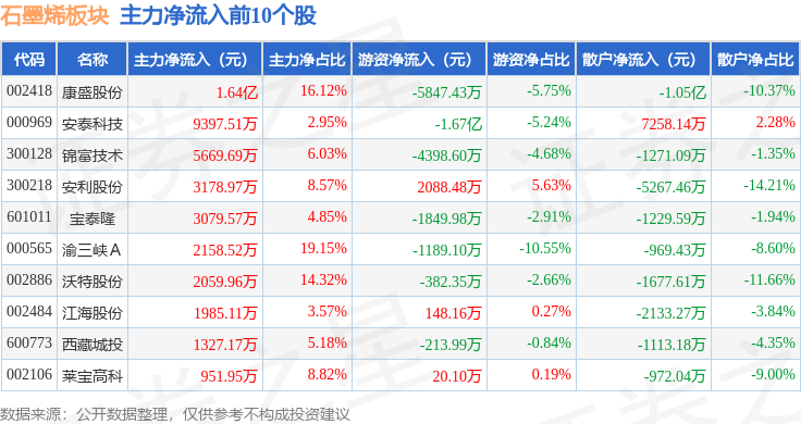 从资金流向上来看,当日石墨烯板块主力资金净流出11.47亿元,游资资金净流出2315.32万元,散户资金净流入11.7亿元。石墨烯板块个股资金流向见下表:
