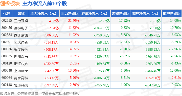 从资金流向上来看,当日创投板块主力资金净流出10.46亿元,游资资金净流出2379.72万元,散户资金净流入10.7亿元。创投板块个股资金流向见下表: