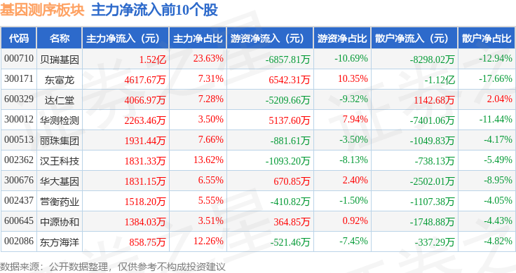 从资金流向上来看,当日基因测序板块主力资金净流入6389.35万元,游资资金净流入2.95亿元,散户资金净流出3.59亿元。基因测序板块个股资金流向见下表: