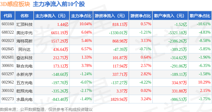 从资金流向上来看,当日3D感应板块主力资金净流出6.89亿元,游资资金净流入5288.06万元,散户资金净流入6.36亿元。3D感应板块个股资金流向见下表: