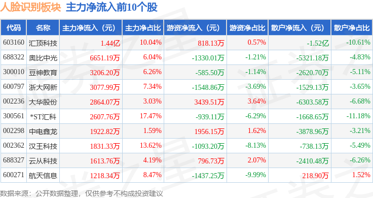 从资金流向上来看,当日人脸识别板块主力资金净流入794.66万元,游资资金净流入1.04亿元,散户资金净流出1.12亿元。人脸识别板块个股资金流向见下表: