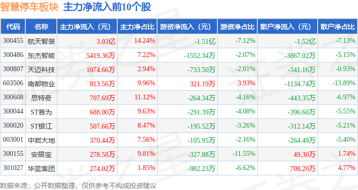 从资金流向上来看,当日智慧停车板块主力资金净流出2.25亿元,游资资金净流出3506.91万元,散户资金净流入2.6亿元。智慧停车板块个股资金流向见下表: