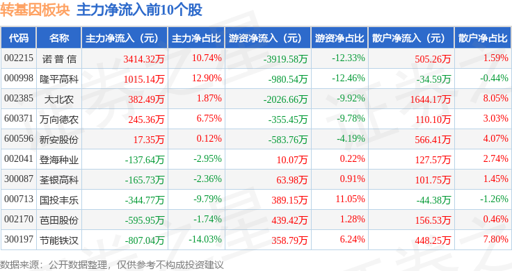 从资金流向上来看,当日转基因板块主力资金净流入1129.44万元,游资资金净流出6121.8万元,散户资金净流入4992.35万元。转基因板块个股资金流向见下表: