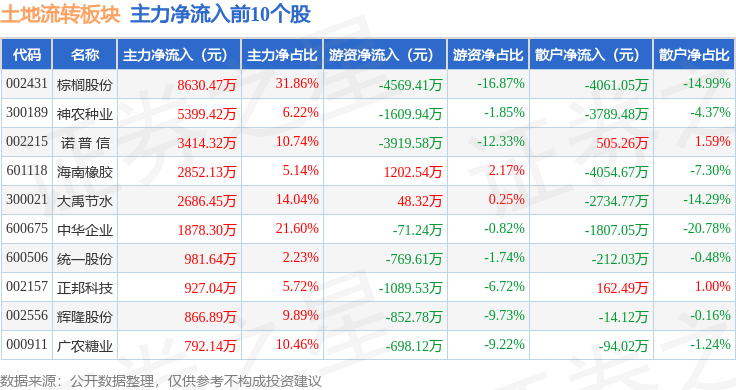 从资金流向上来看,当日土地流转板块主力资金净流入1374.88万元,游资资金净流出5315.81万元,散户资金净流入3940.6万元。土地流转板块个股资金流向见下表: