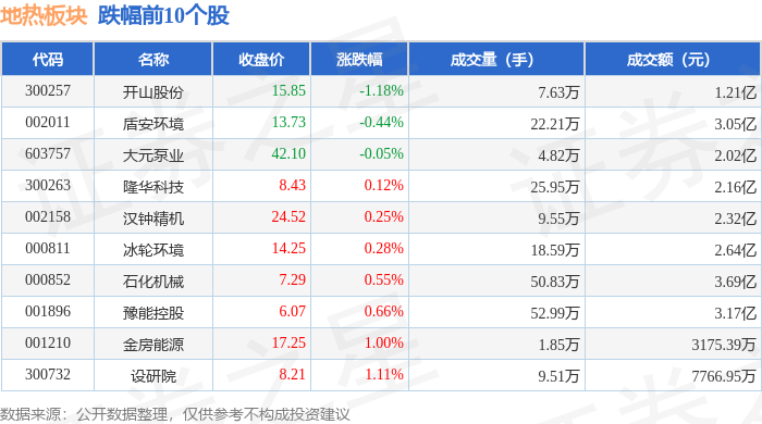 证券之星消息,11月3日地热板块较上一交易日上涨1.92%,华光环能领涨。当日上证指数报收于3976.52,上涨0.55%。深证成指报收于13404.06,上涨0.19%。地热板块个股涨跌见下表: