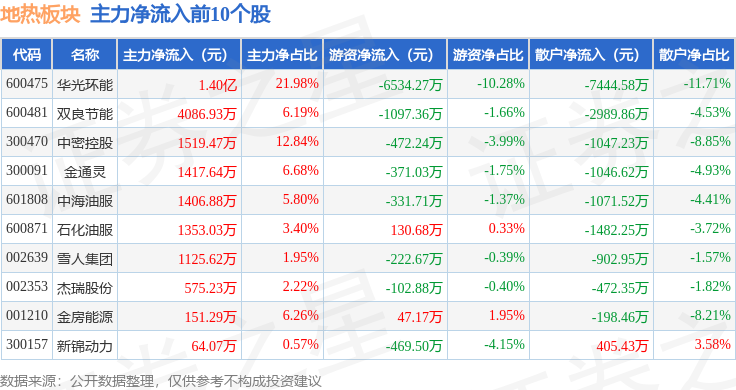 从资金流向上来看,当日地热板块主力资金净流入6655.76万元,游资资金净流出6762.76万元,散户资金净流入112.33万元。地热板块个股资金流向见下表: