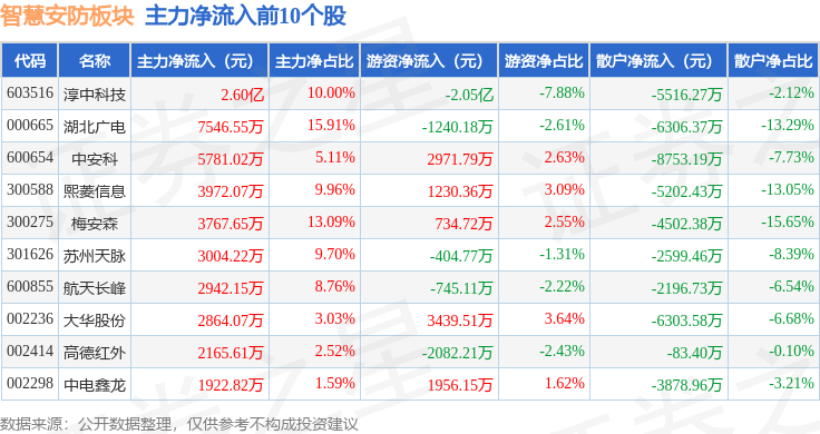 从资金流向上来看,当日智慧安防板块主力资金净流出20.99亿元,游资资金净流入6.96亿元,散户资金净流入14.04亿元。智慧安防板块个股资金流向见下表: