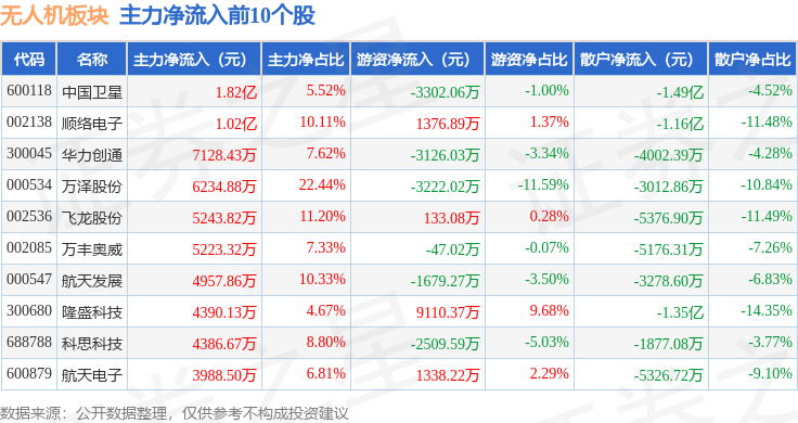 从资金流向上来看,当日无人机板块主力资金净流出10.08亿元,游资资金净流入4.36亿元,散户资金净流入5.73亿元。无人机板块个股资金流向见下表: