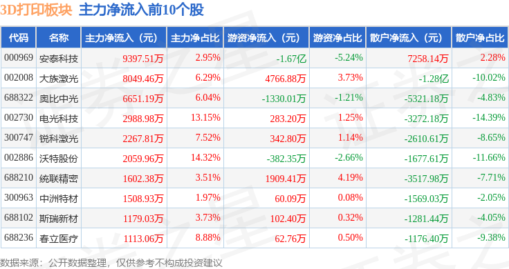 从资金流向上来看,当日3D打印板块主力资金净流出7.39亿元,游资资金净流入8574.41万元,散户资金净流入6.53亿元。3D打印板块个股资金流向见下表: