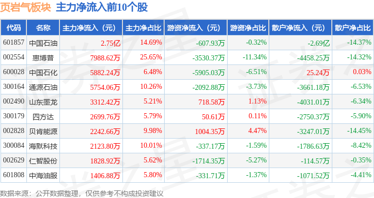 从资金流向上来看,当日页岩气板块主力资金净流入5.04亿元,游资资金净流出1.54亿元,散户资金净流出3.5亿元。页岩气板块个股资金流向见下表: