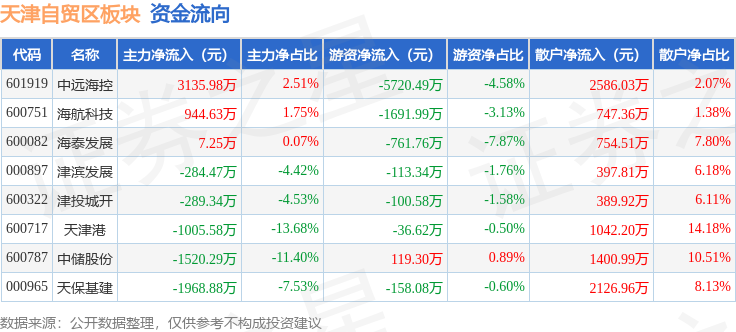 从资金流向上来看,当日天津自贸区板块主力资金净流出980.69万元,游资资金净流出8463.56万元,散户资金净流入9445.77万元。天津自贸区板块个股资金流向见下表: