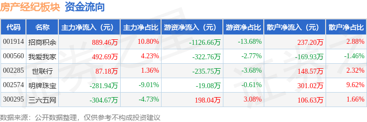 从资金流向上来看,当日房产经纪板块主力资金净流入882.72万元,游资资金净流出1506.21万元,散户资金净流入623.49万元。房产经纪板块个股资金流向见下表: