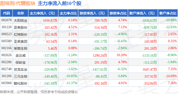从资金流向上来看,当日甜味剂/代糖板块主力资金净流出2.1亿元,游资资金净流入8483.71万元,散户资金净流入1.25亿元。甜味剂/代糖板块个股资金流向见下表: