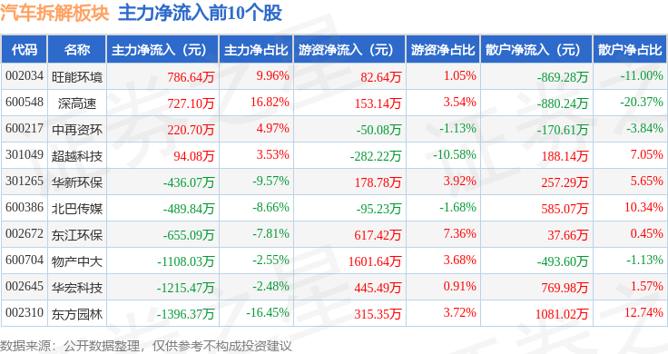 从资金流向上来看,当日汽车拆解板块主力资金净流出4.63亿元,游资资金净流入1.55亿元,散户资金净流入3.08亿元。汽车拆解板块个股资金流向见下表: