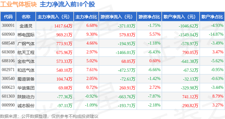 从资金流向上来看,当日工业气体板块主力资金净流出10.73亿元,游资资金净流入8168.26万元,散户资金净流入9.91亿元。工业气体板块个股资金流向见下表: