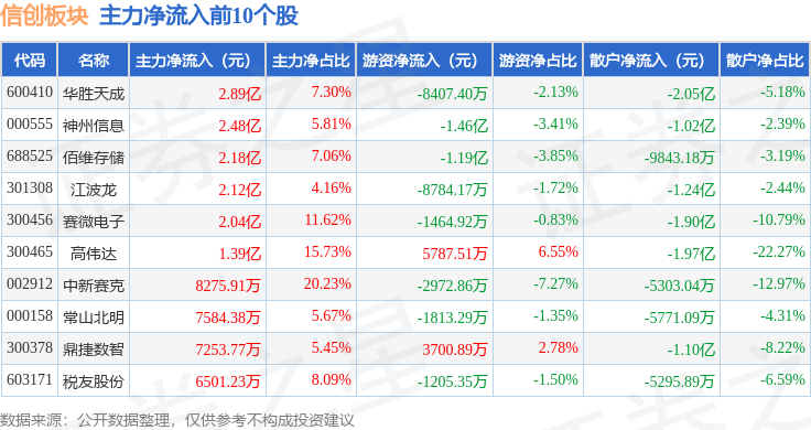 从资金流向上来看,当日信创板块主力资金净流出13.39亿元,游资资金净流入8.88亿元,散户资金净流入4.52亿元。信创板块个股资金流向见下表: