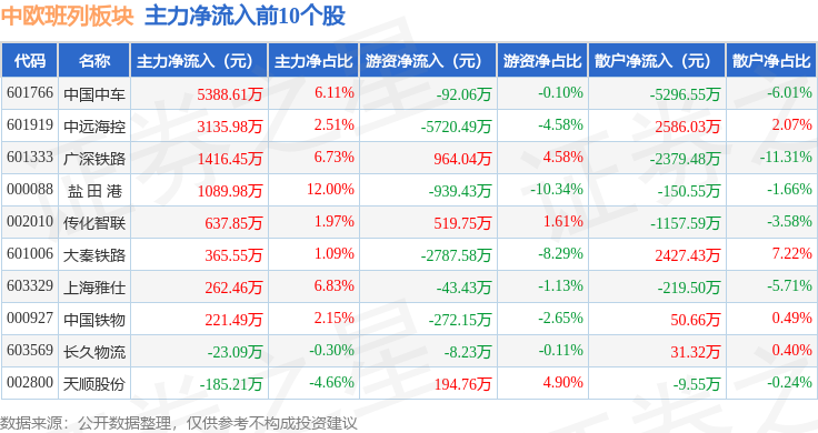 从资金流向上来看,当日中欧班列板块主力资金净流出1767.58万元,游资资金净流出8724.27万元,散户资金净流入1.05亿元。中欧班列板块个股资金流向见下表:
