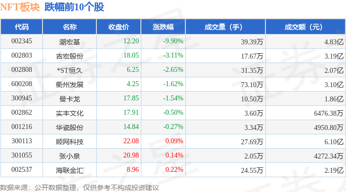 从资金流向上来看,当日NFT板块主力资金净流入5340.3万元,游资资金净流入6881.88万元,散户资金净流出1.22亿元。NFT板块个股资金流向见下表: