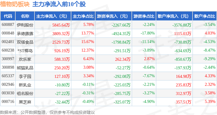 从资金流向上来看,当日植物奶板块主力资金净流入5372.63万元,游资资金净流出1.04亿元,散户资金净流入5015.28万元。植物奶板块个股资金流向见下表: