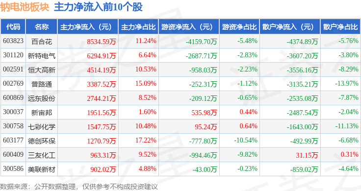 从资金流向上来看,当日钠电池板块主力资金净流出40.42亿元,游资资金净流入7.61亿元,散户资金净流入32.81亿元。钠电池板块个股资金流向见下表: