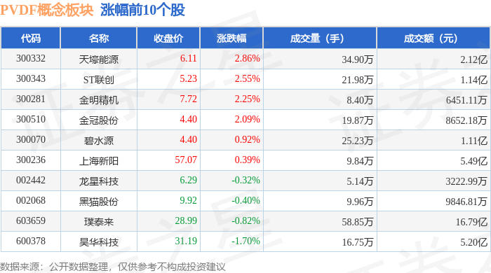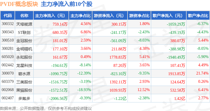 从资金流向上来看,当日PVDF概念板块主力资金净流出5.79亿元,游资资金净流入6510.76万元,散户资金净流入5.14亿元。PVDF概念板块个股资金流向见下表: